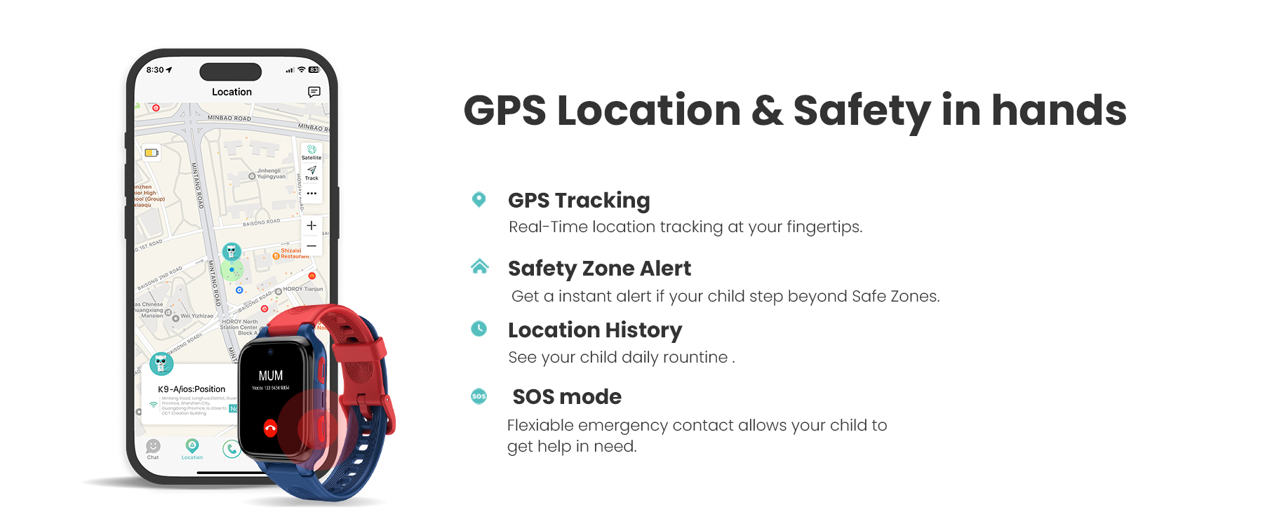 - ONE-KEY SOS Your child's safety is our top priority. The one-key SOS function allows your child to contact up to three pre-set emergency contacts by pressing the SOS button for five seconds. The watch will call each number twice until the call is answered.