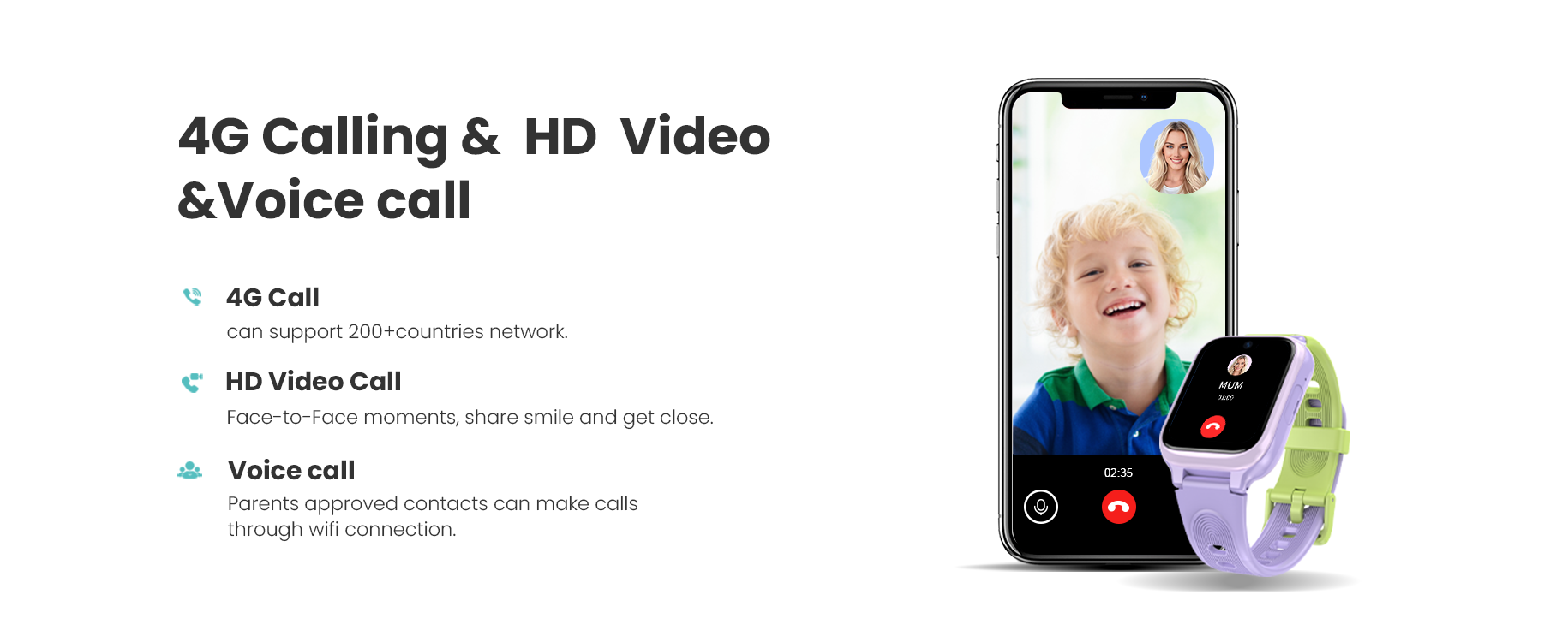 - PRACTICAL PARENTAL CONTROL FEATURES Download the FREE custom build and easy-to-use parental control app with no ads (available for iOS and Android) to manage authorized contacts, SOS numbers, and safe zones. Reject unknown calls, set class mode (upto 4), alarms (upto 4), and more. Monitor your child's environment with “Remote Voice Monitoring” and take “Remote Photos” from the watch camera.